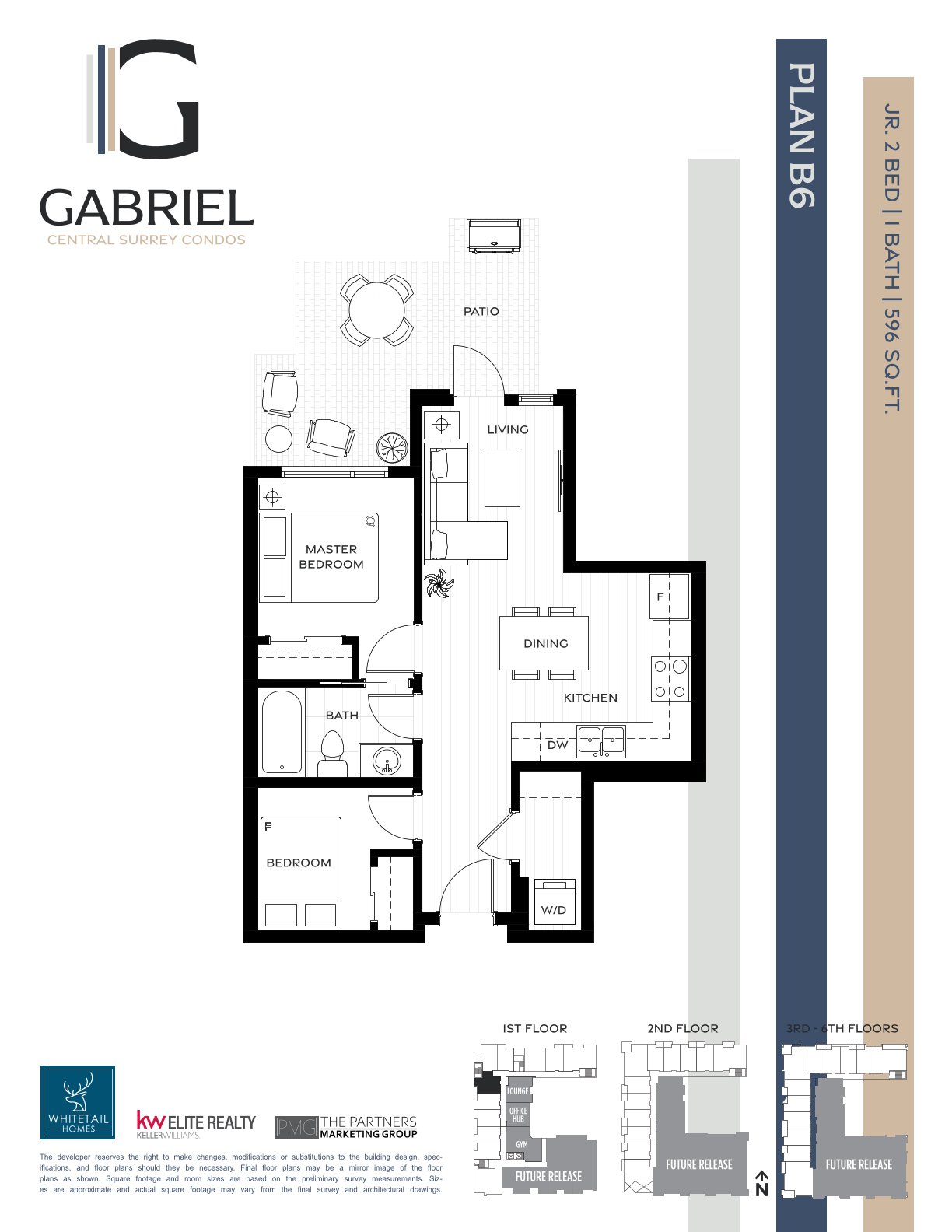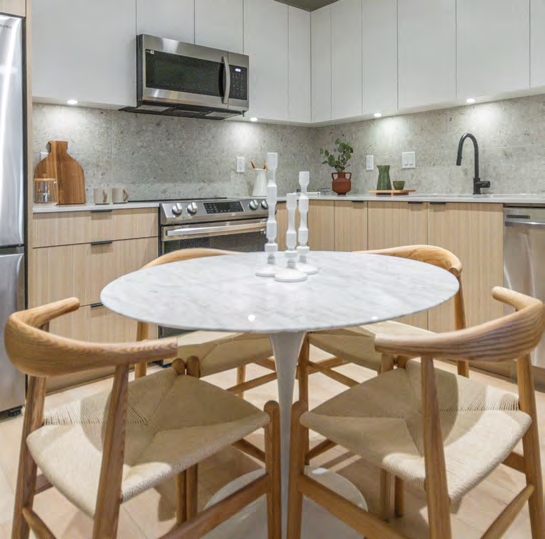 为一栋6层高现代风格建筑,共提供125套1-3卧公寓,室内面积在525-1,149平方英尺不等,每套单位均带有一个车位。